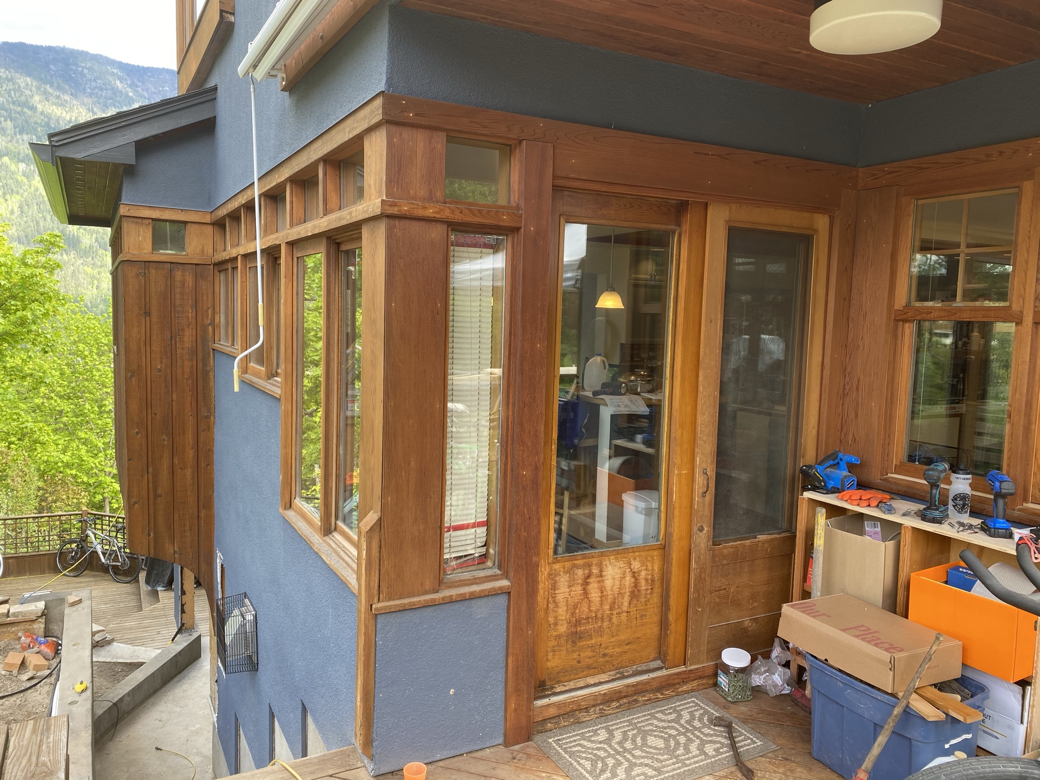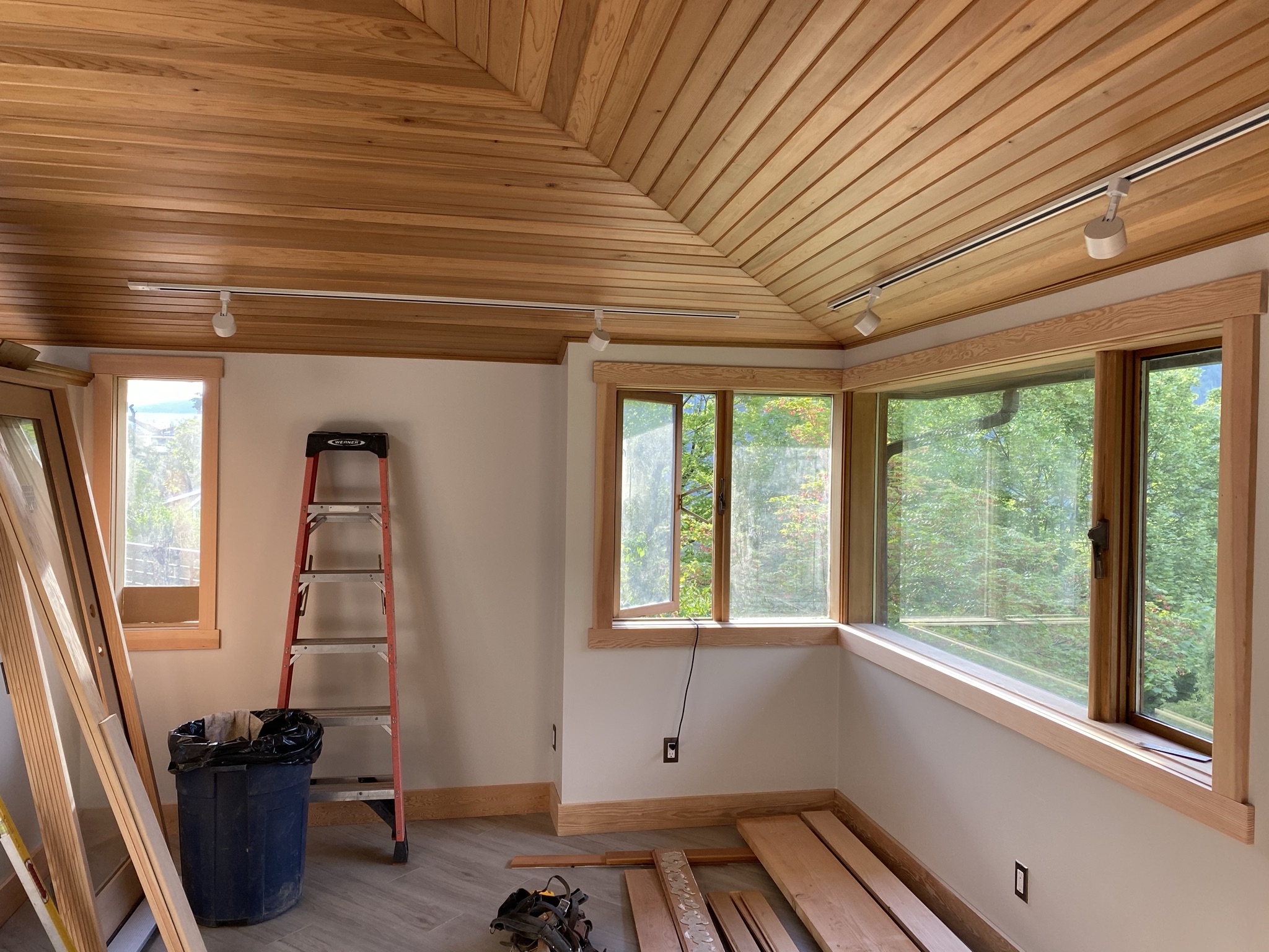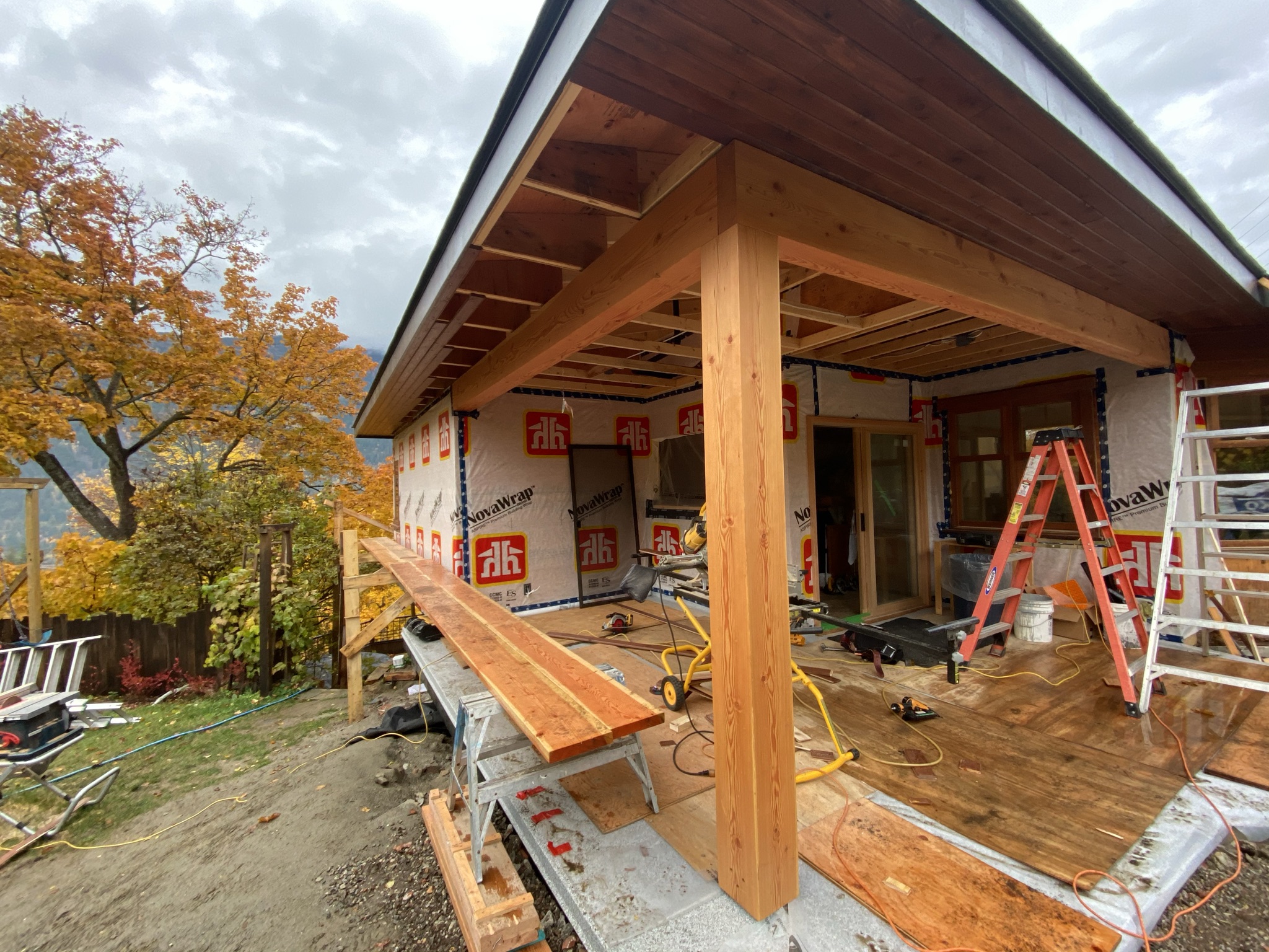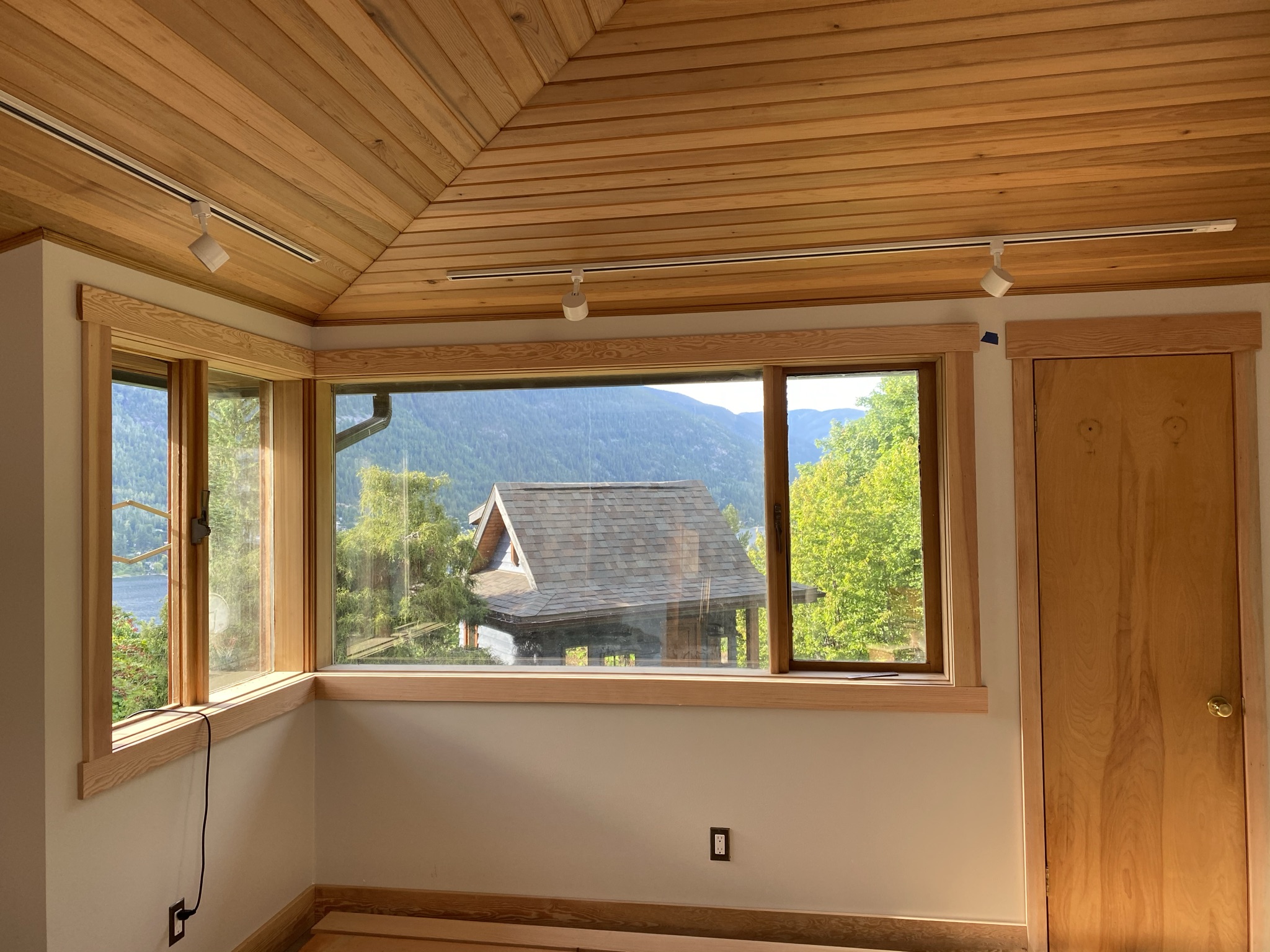 This project included the expansion of an exterior covered deck that utilized timber framing. The renovation continued inside with tongue and grooved ceiling, and new doors.